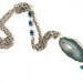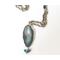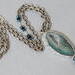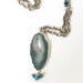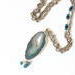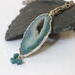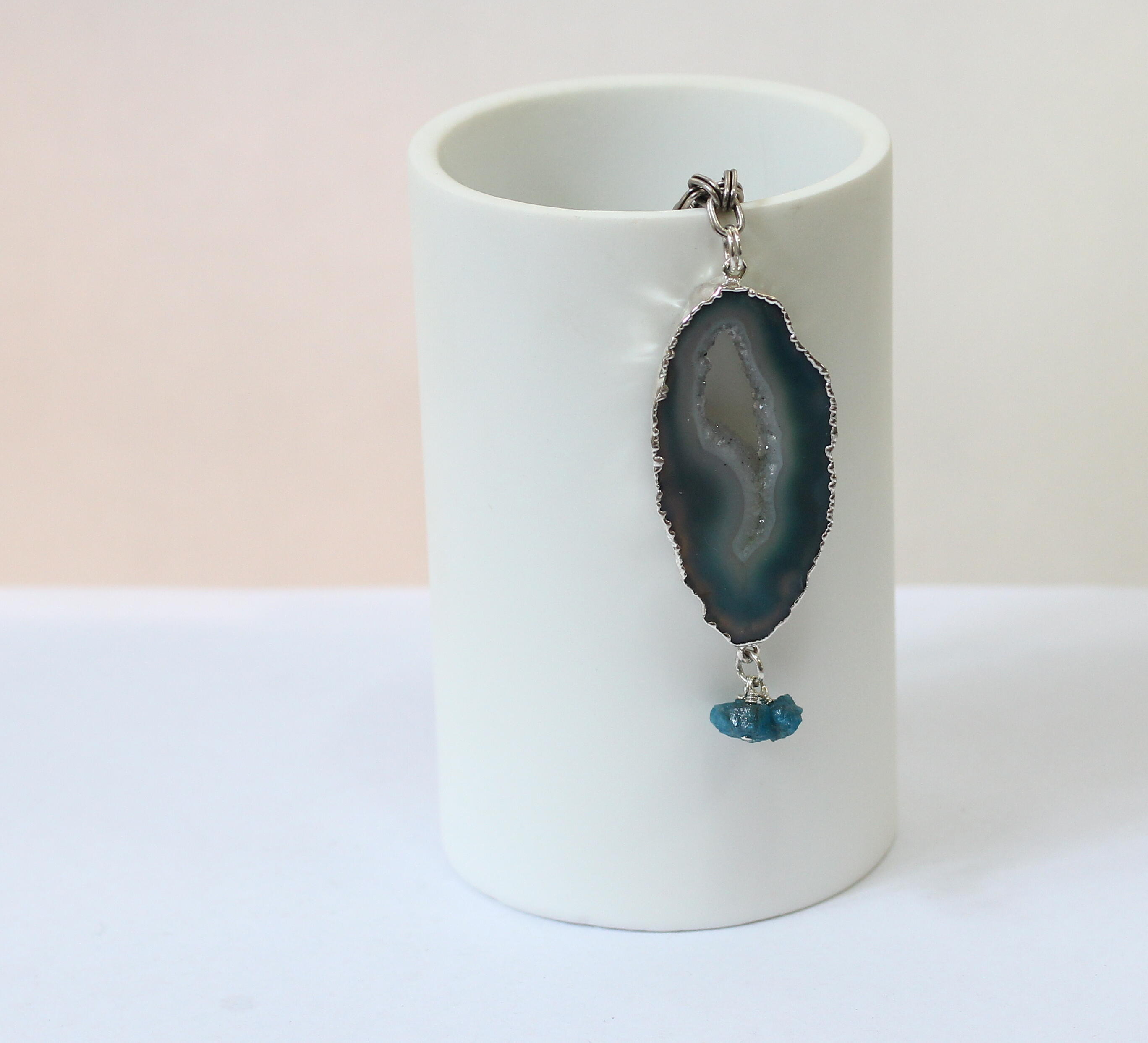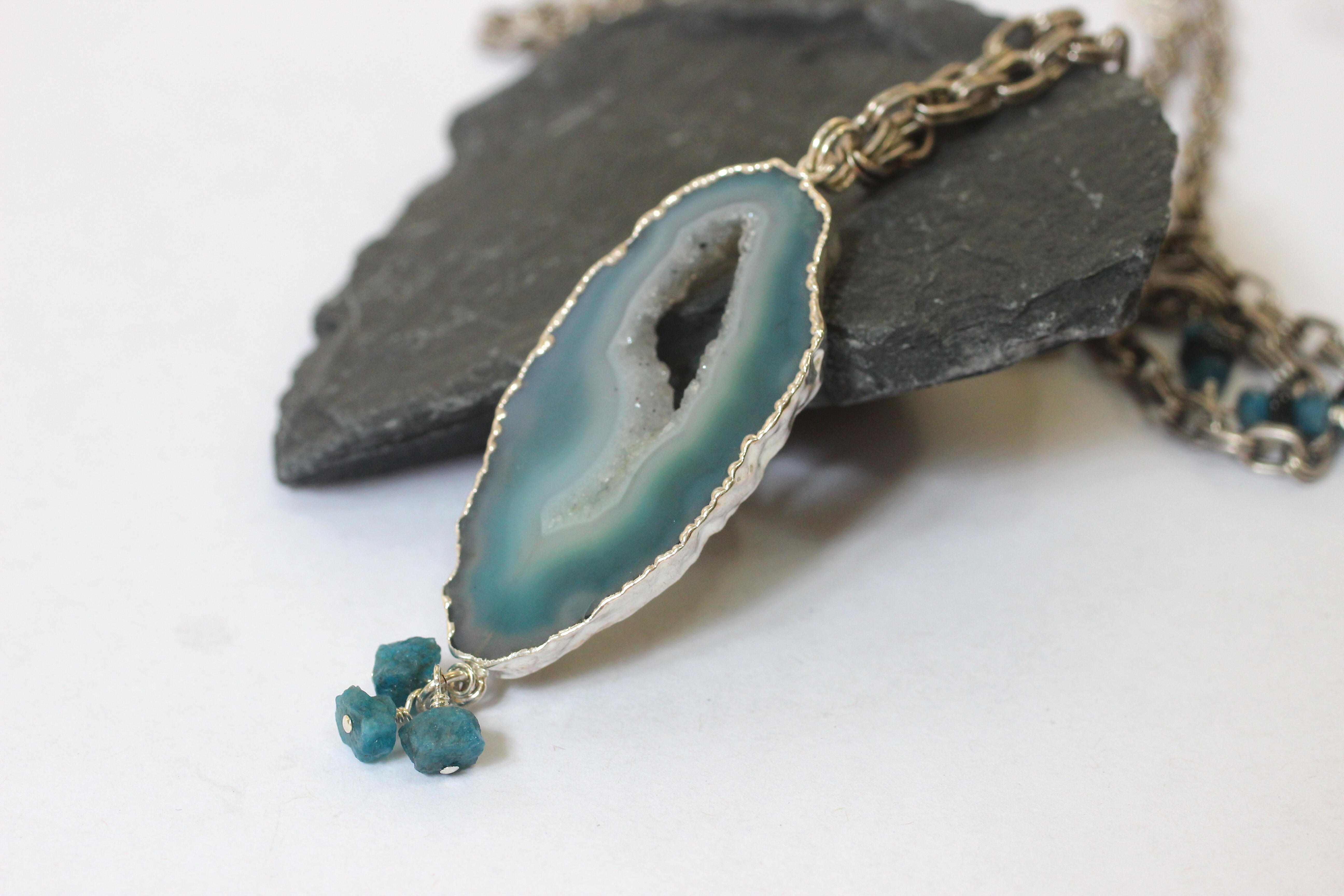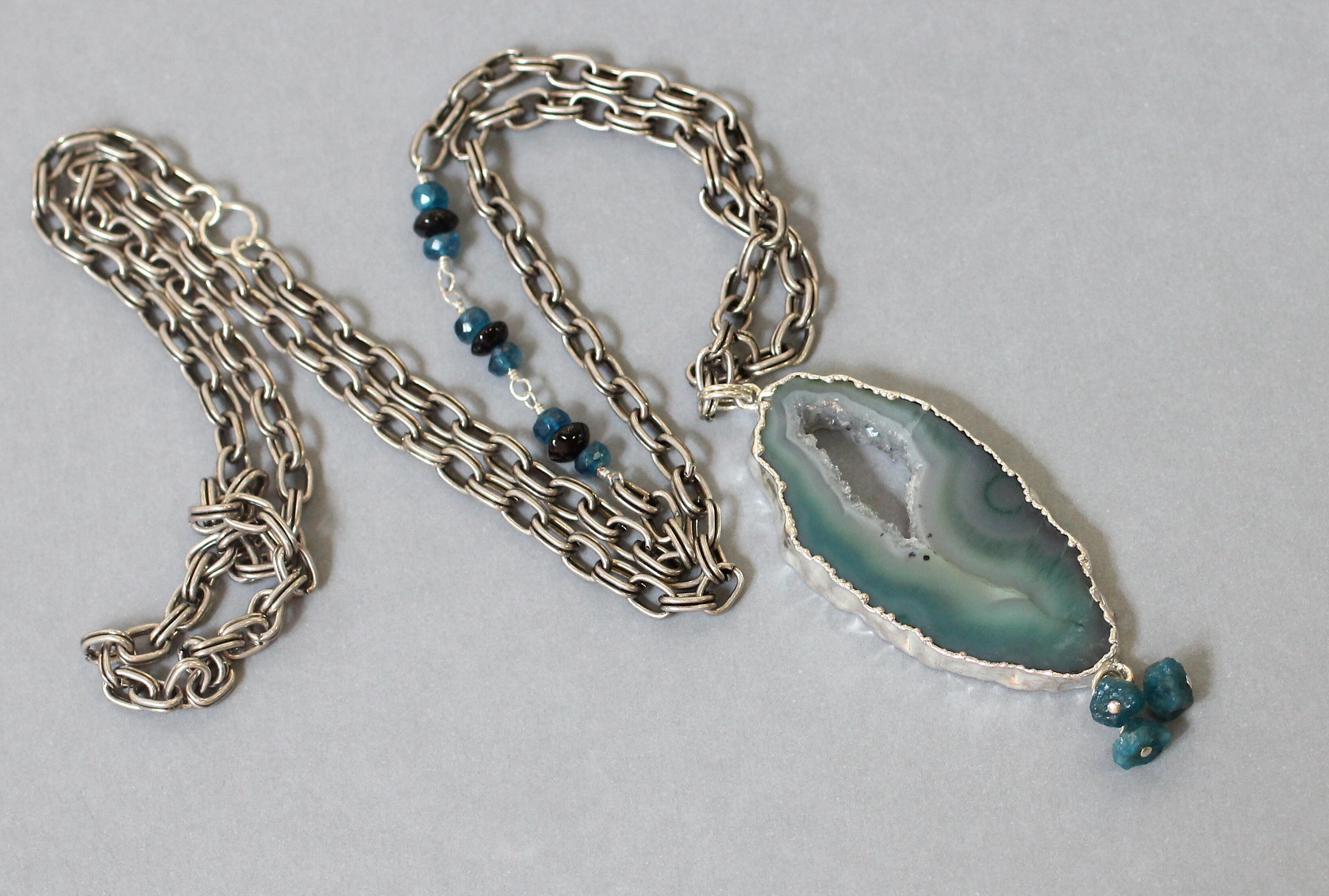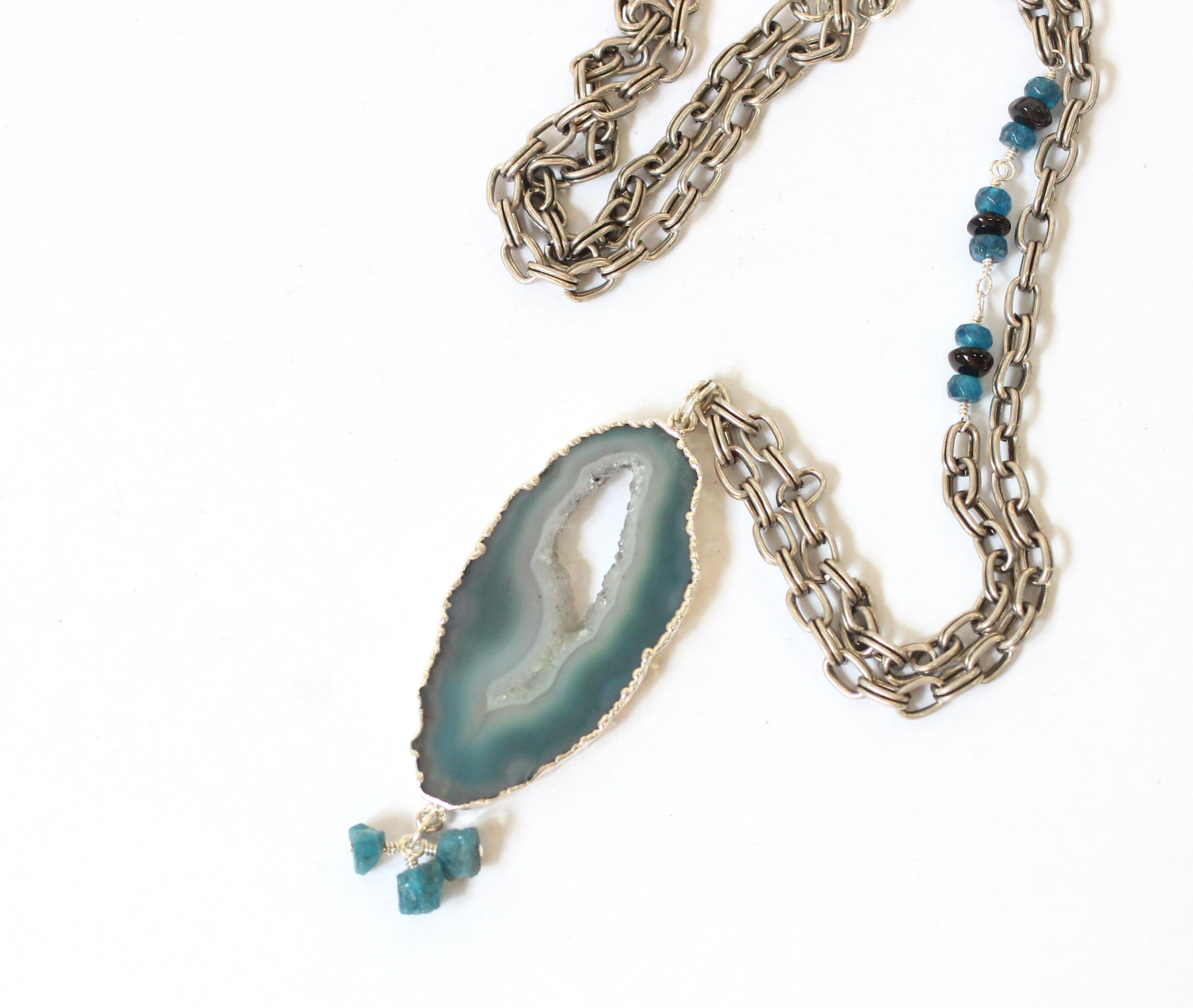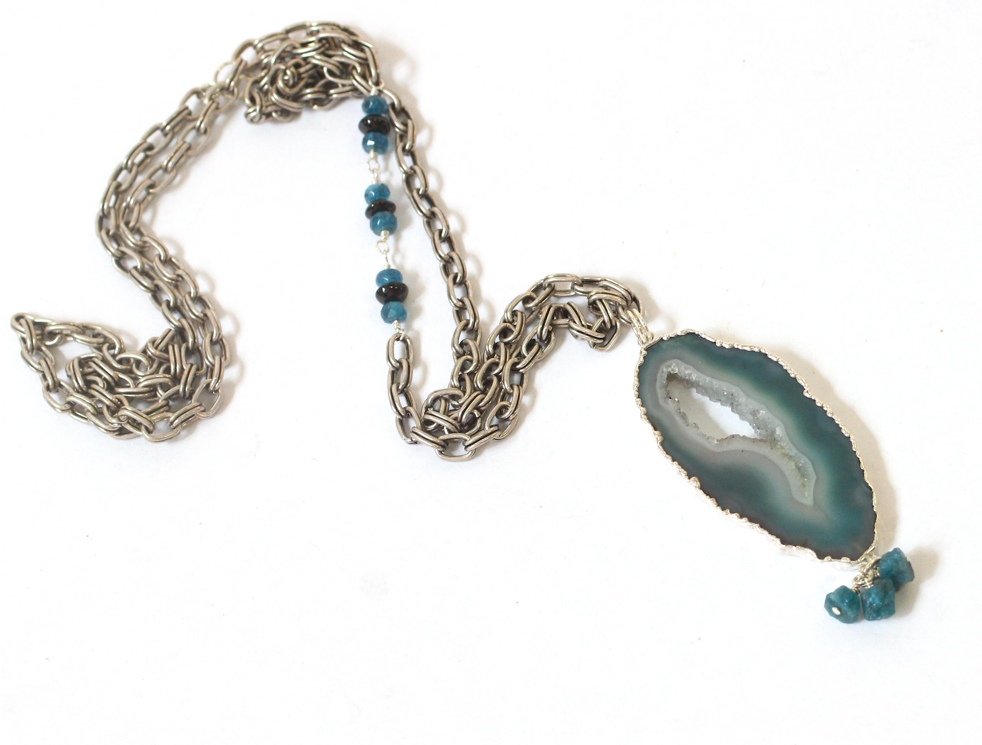 Popular and rich color in this teal agate slice necklace, featured on chunky silver chain. It would look wonderful with a tee or sweater. The agate slice showcases a shimmering druzy pocket and is electroplated in silver. Three raw apatite stones adorn the agate slice, all delicately wrapped in sterling silver. On the antique silver plated chain, accented stones complement the teal agate, including black spinel and teal apatite rondelles.