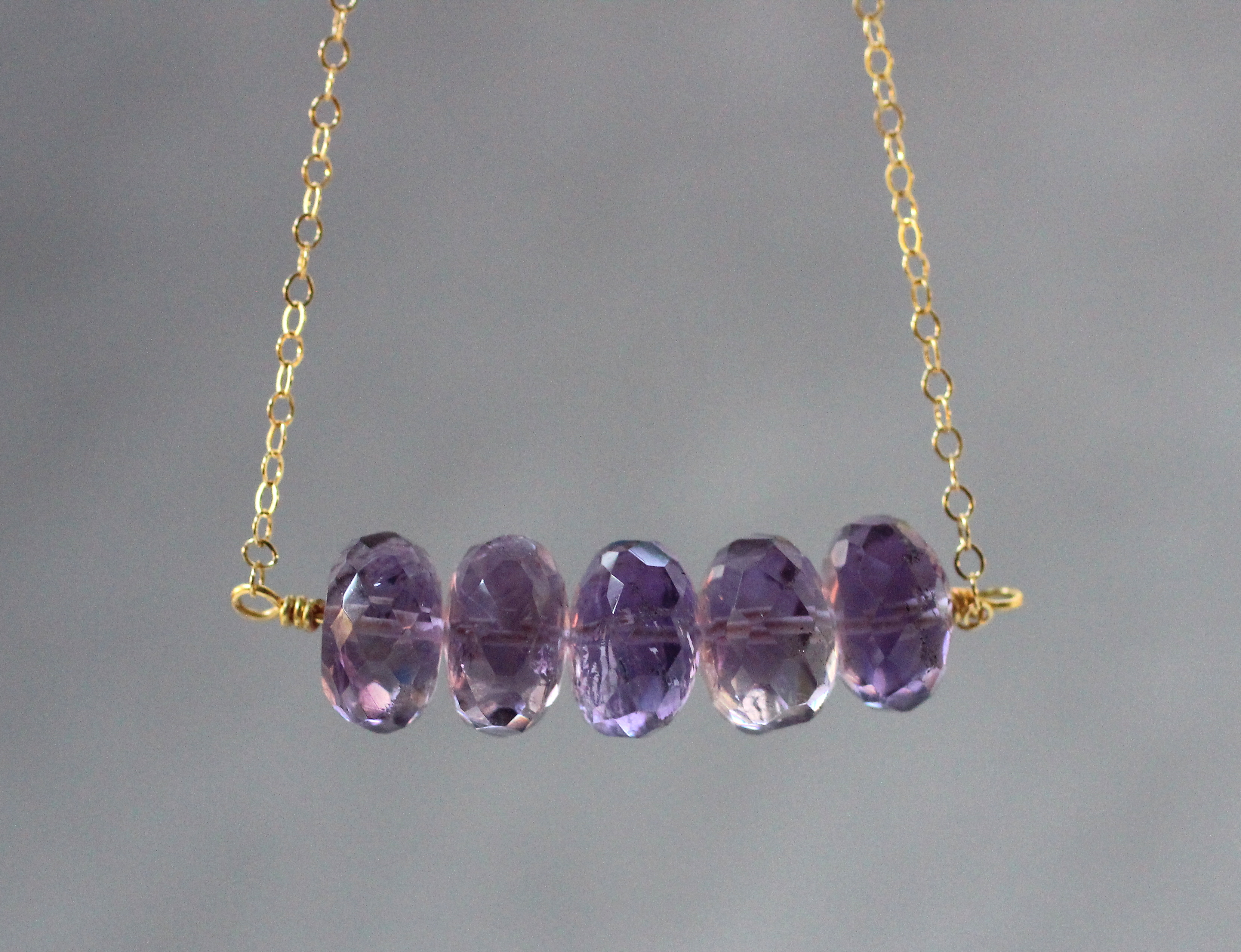 Juicy gemstones! Five large amethyst rondelles are stunning and highly faceted in this February birthstone necklace. A minimalist necklace style, it is ideal as a February birthday gift or for the woman who loves amethyst. The amethyst necklace features a delicate gold filled chain and components; it can be worn alone or layered with other necklaces. The amethyst beads are a large size, 10mm, and beautifully faceted. Simple in style and adjustable, finished with an amethyst teardrop briolette as a little embellishment.