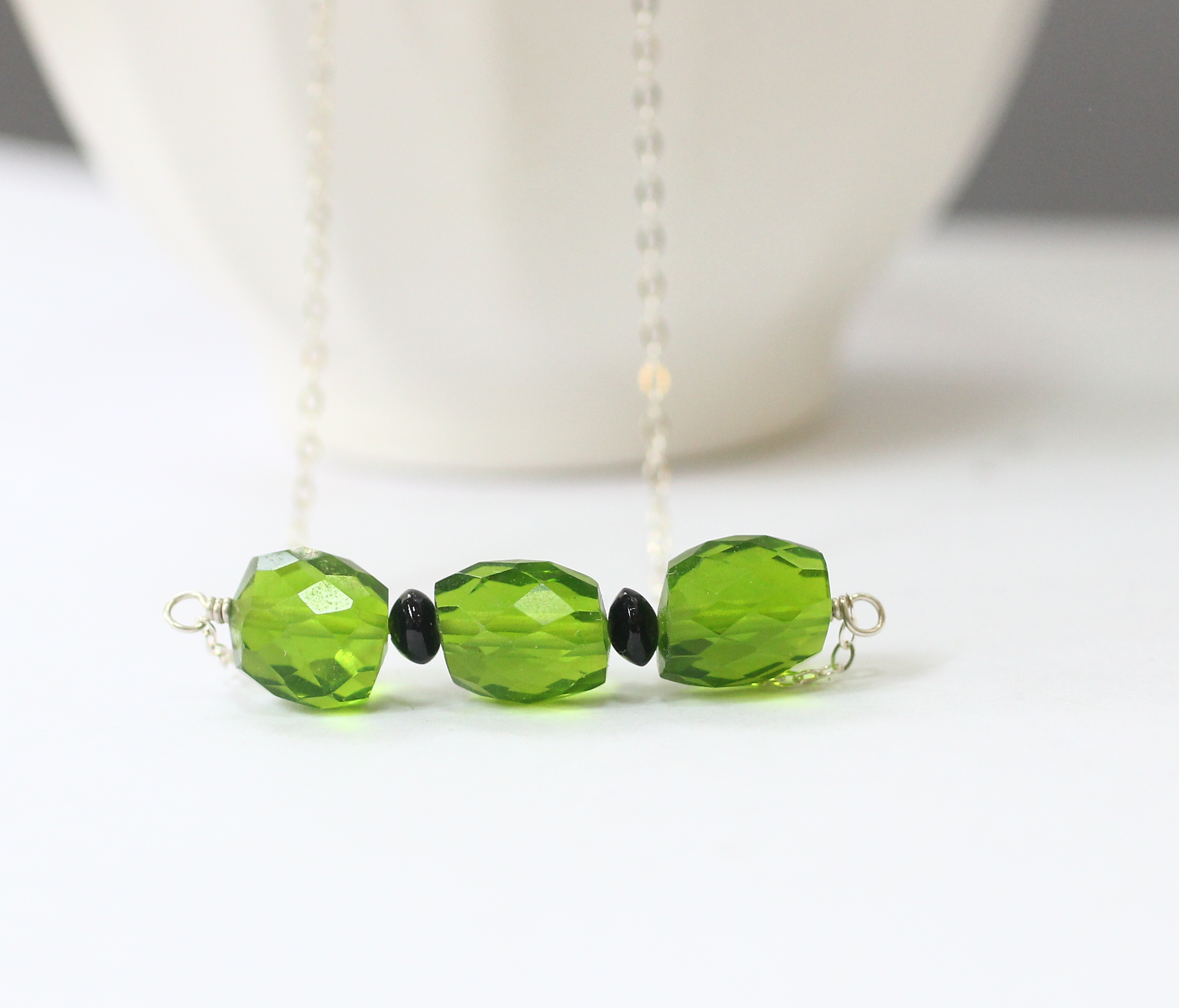 Three sparkling peridot quartz rectangles are combined with black spinel saucers for an eye-catching and unique design. Peridot is the birthstone for August and these peridot quartz stones are highly faceted and bursting with color. A gemstone bar that can be combined with other necklaces and layered or worn solo.