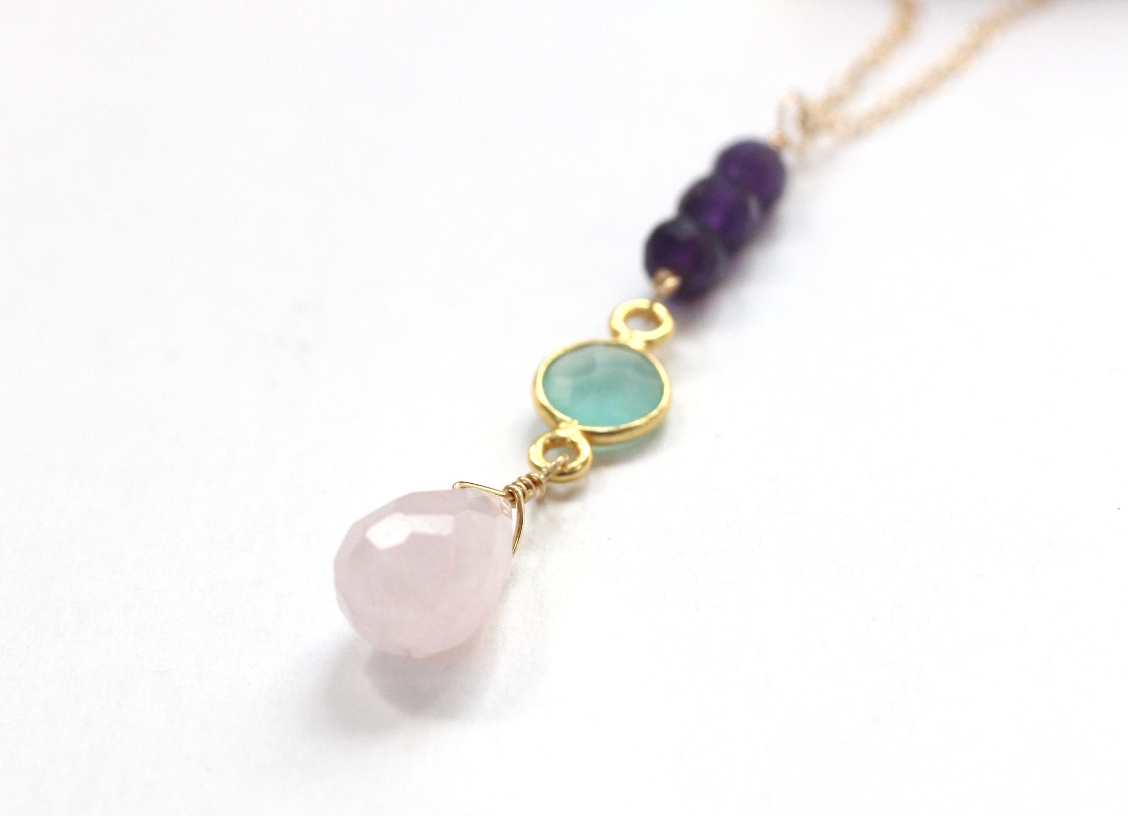 A colorful combination with three beautiful crystals, this rose quartz drop necklace is a darling piece. The rose quartz teardrop is paired with a pretty green chrysoprase connector and deep, rich amethyst. Suspended from gold filled cable chain, this multistone necklace is adjustable from 14 to 16 inches with the 2 inch extender. Finished with a gold filled lobster clasp.