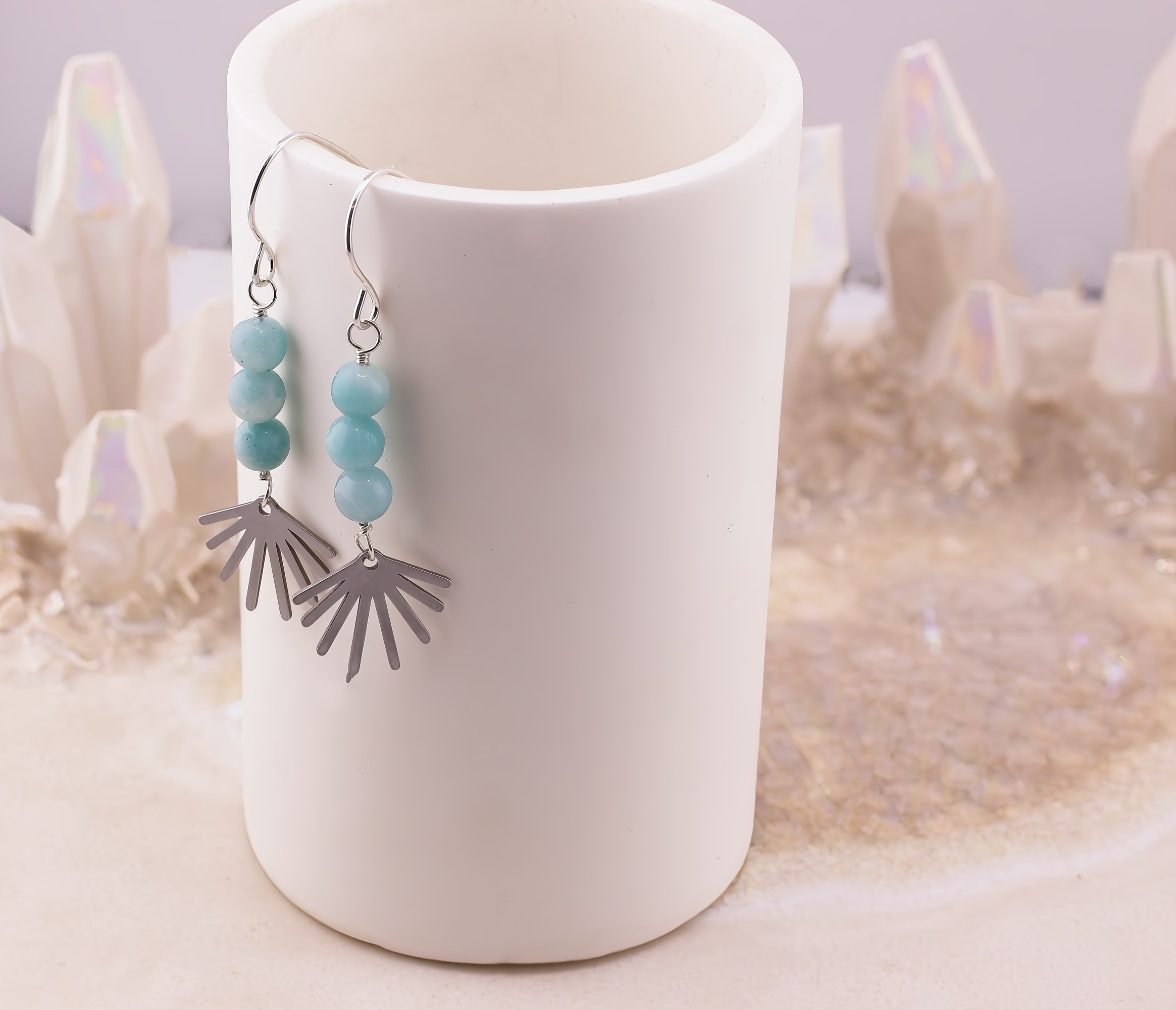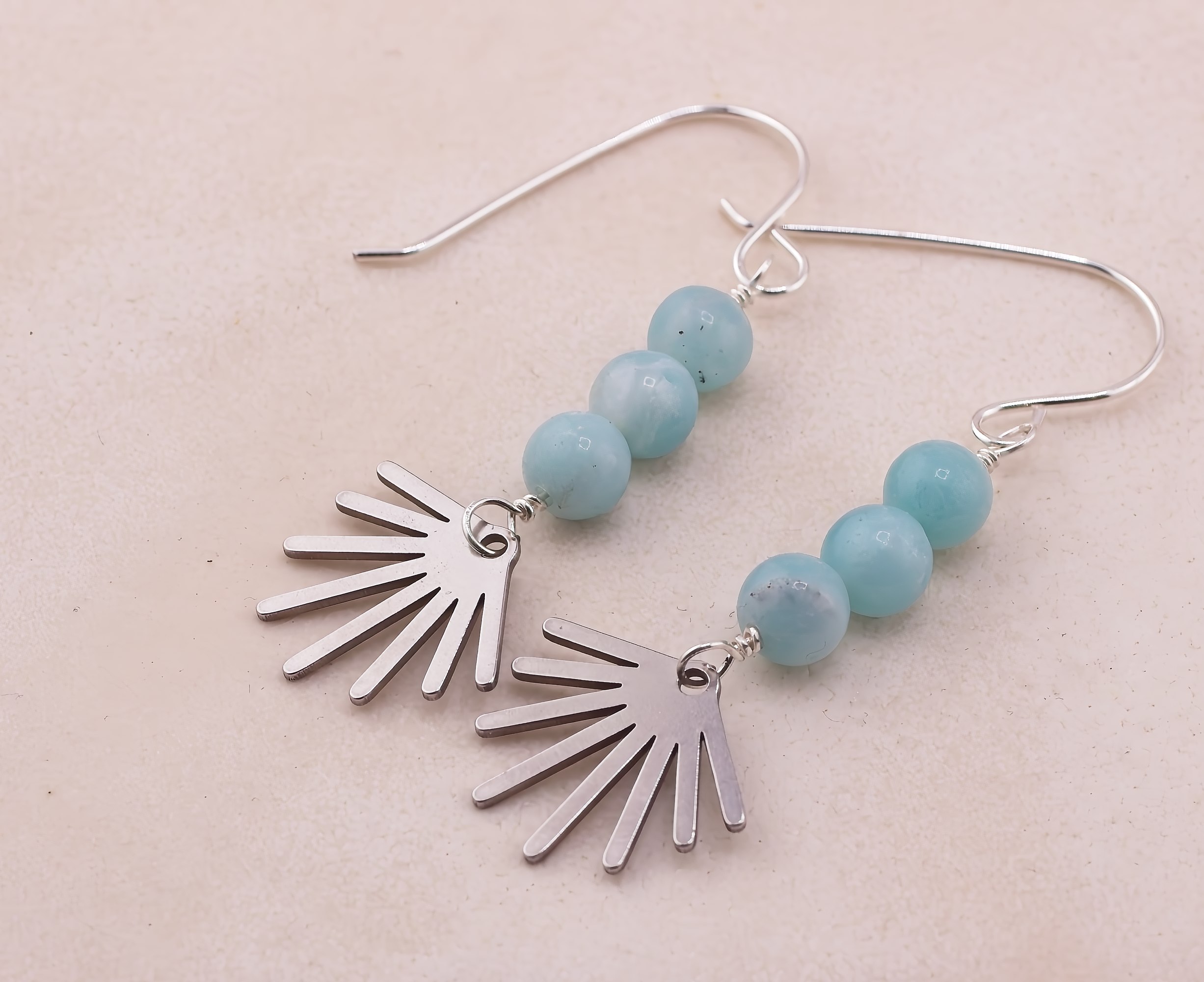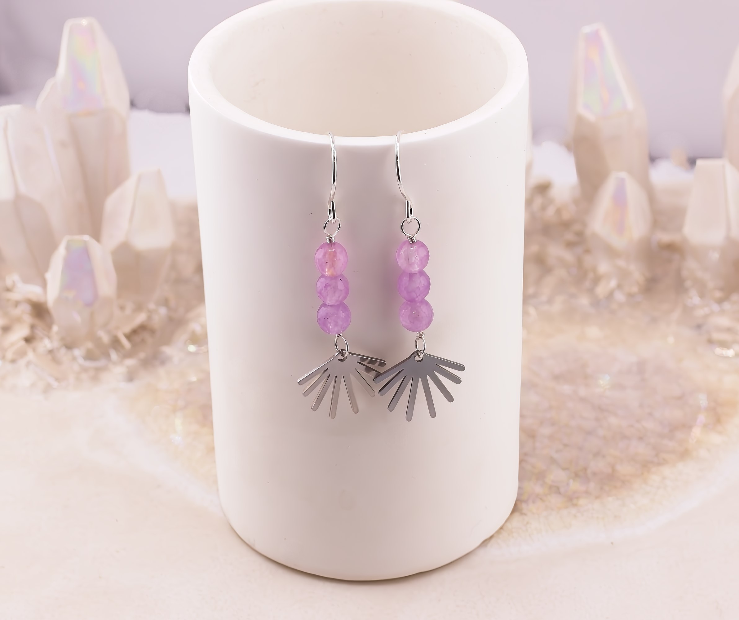 Playful and lighthearted with a touch of modern charm, these whimsical earrings feature a trio of softly glowing gemstones paired with a fun little sunburst accent. Available in dreamy lilac quartz, luminous white mother of pearl, or fresh amazonite, each stone option brings its own natural personality. The polished sunburst adds a cheerful, graphic detail that beneath the stones, creating movement and sparkle. Finished with hand-forged Argentium silver earwires that are naturally anti-tarnish, these earrings are comfortable, lightweight, and perfect for adding a pop of joy to everyday outfits or gifting to someone who loves a little sunshine in their style.