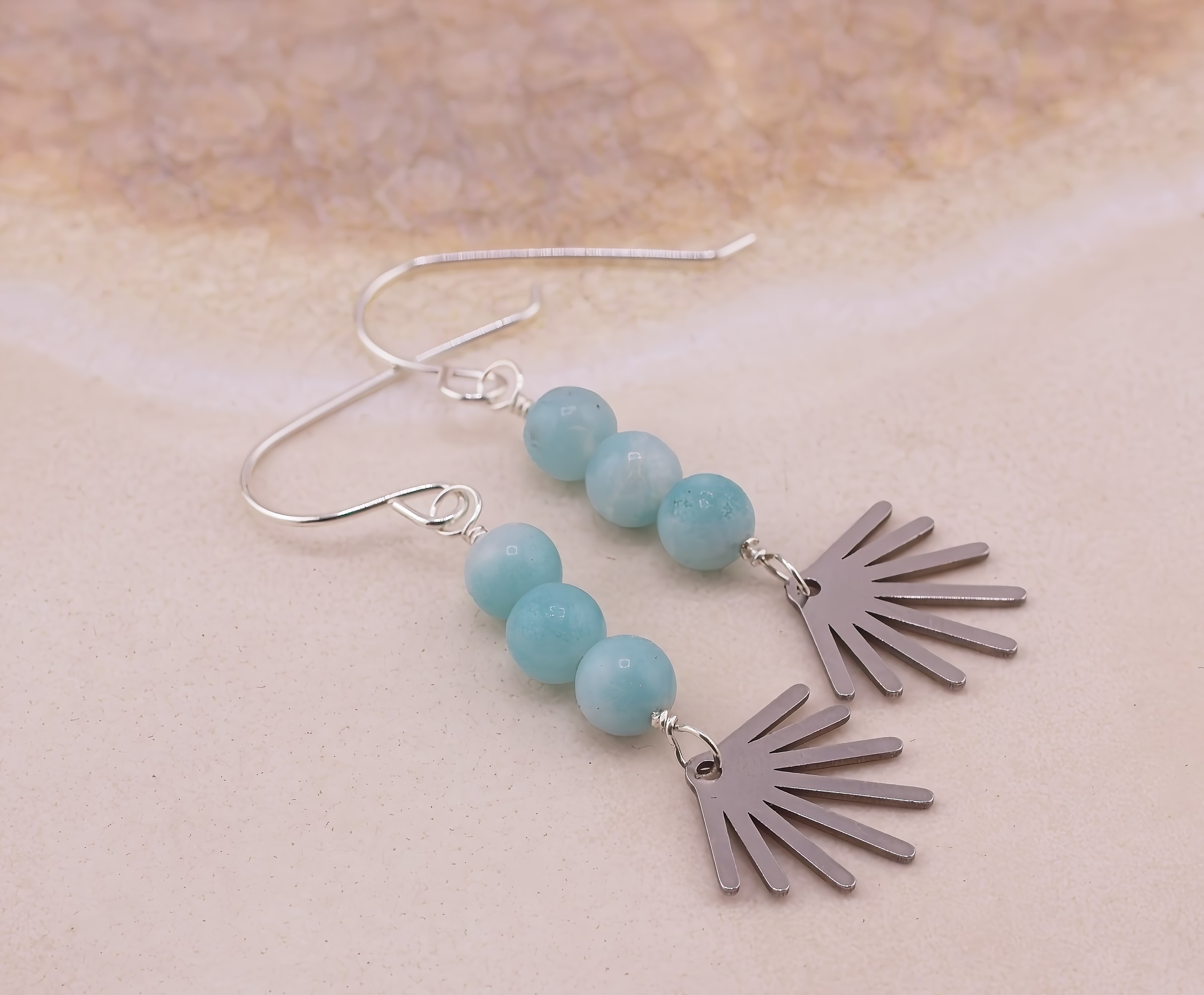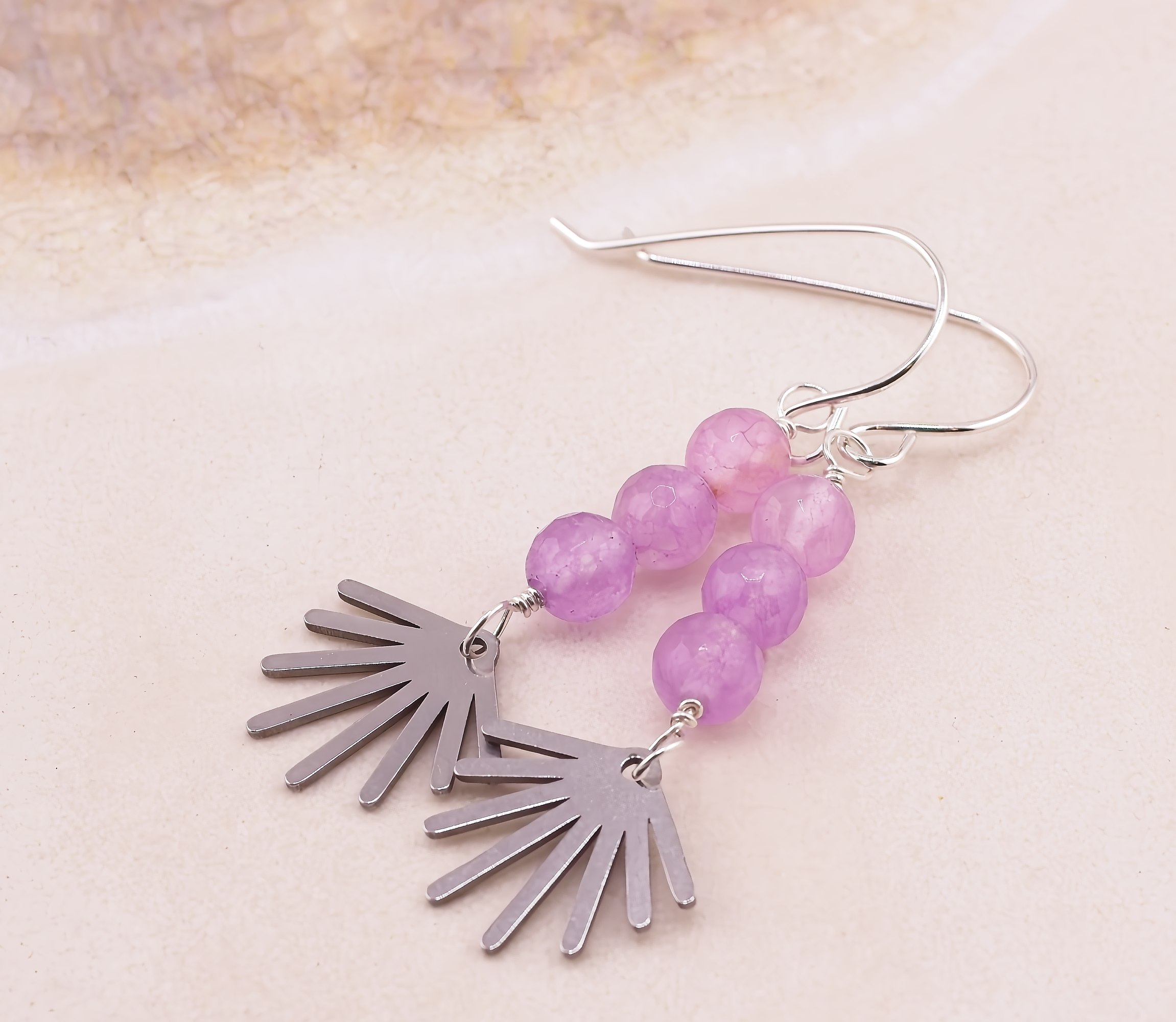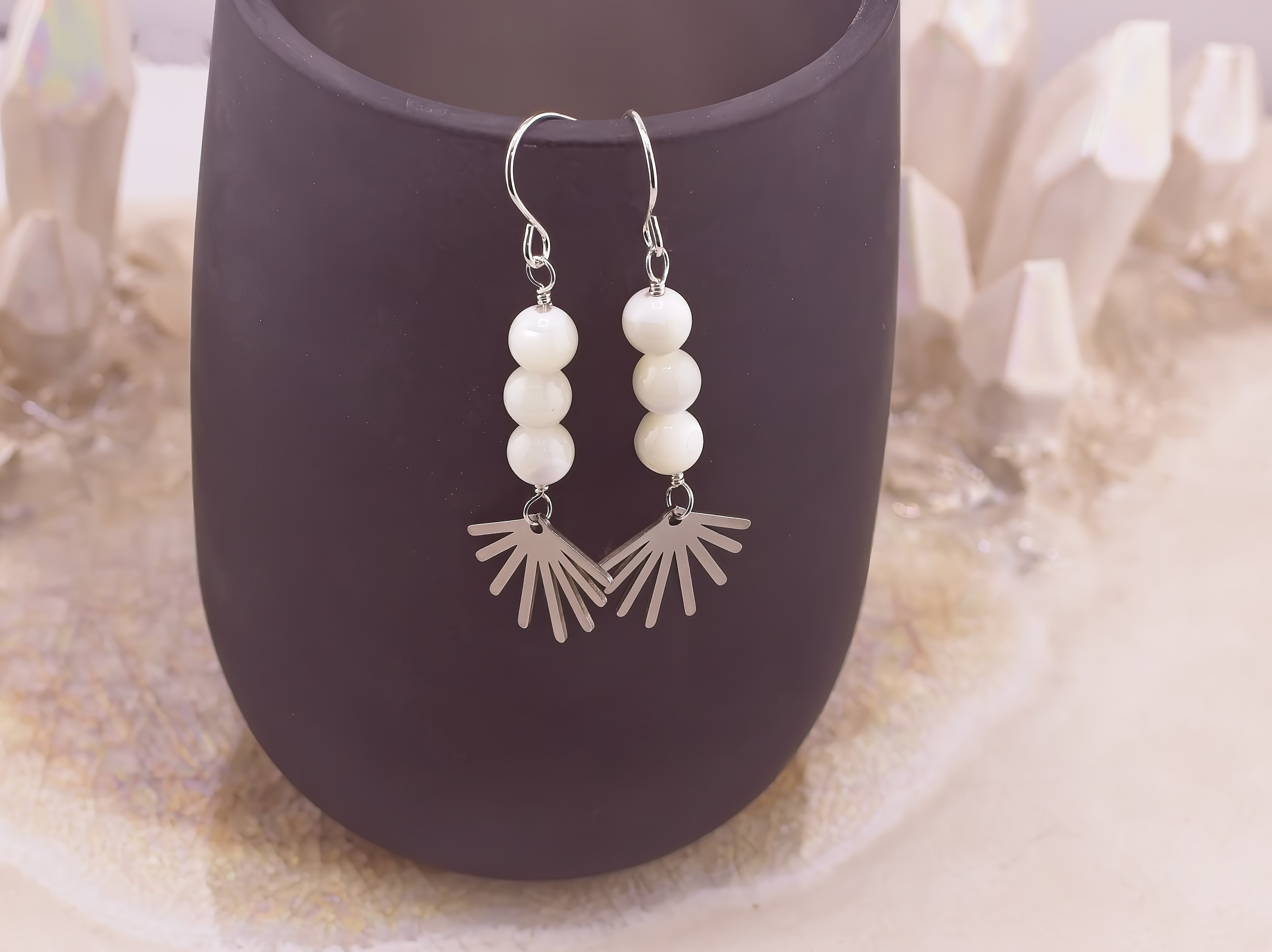 Playful and lighthearted with a touch of modern charm, these whimsical earrings feature a trio of softly glowing gemstones paired with a fun little sunburst accent. Available in dreamy lilac quartz, luminous white mother of pearl, or fresh amazonite, each stone option brings its own natural personality. The polished sunburst adds a cheerful, graphic detail that beneath the stones, creating movement and sparkle. Finished with hand-forged Argentium silver earwires that are naturally anti-tarnish, these earrings are comfortable, lightweight, and perfect for adding a pop of joy to everyday outfits or gifting to someone who loves a little sunshine in their style.