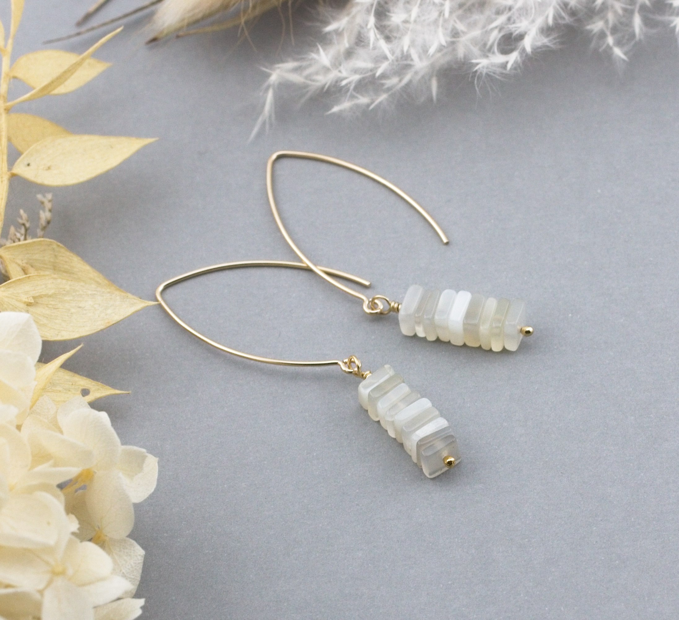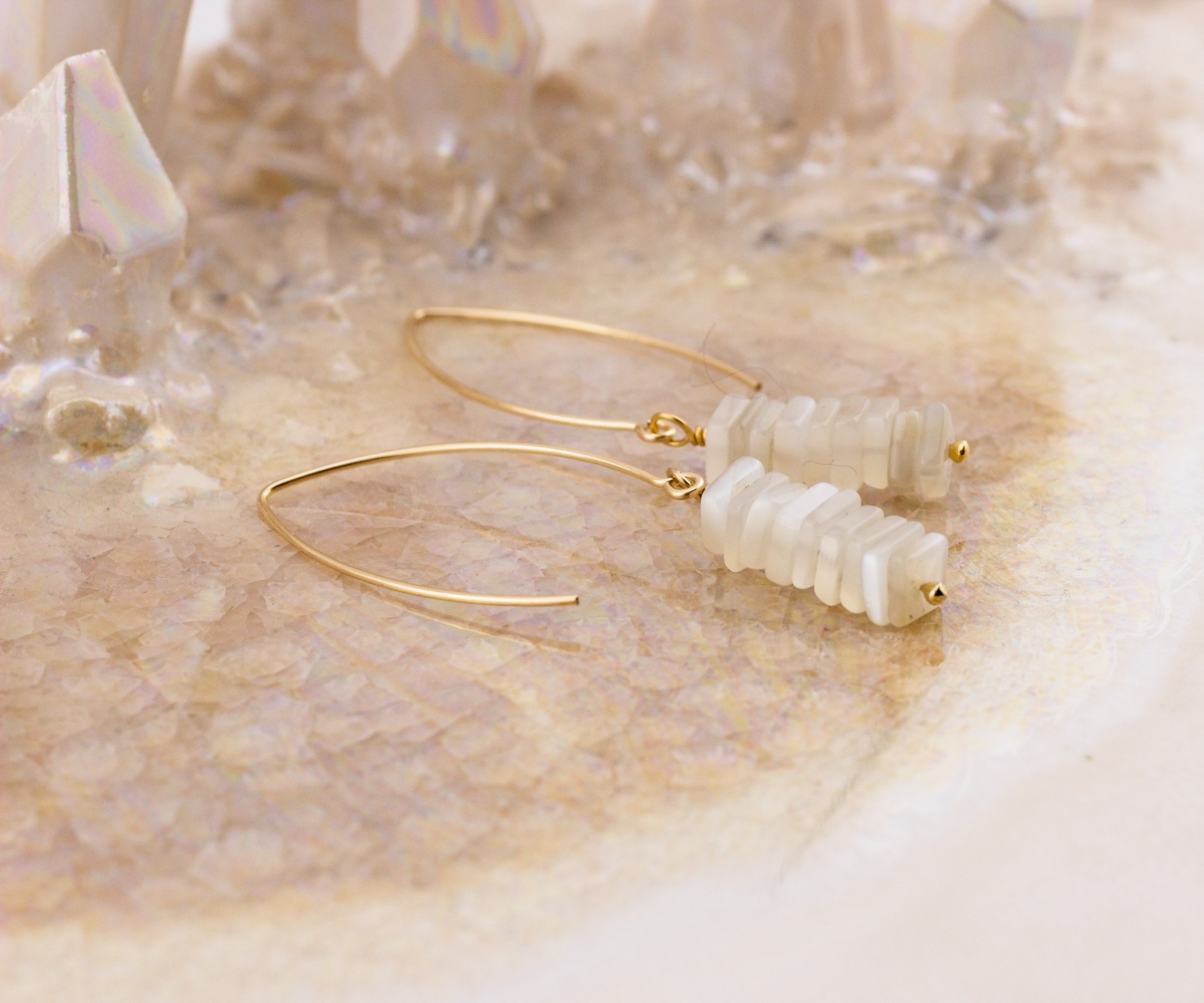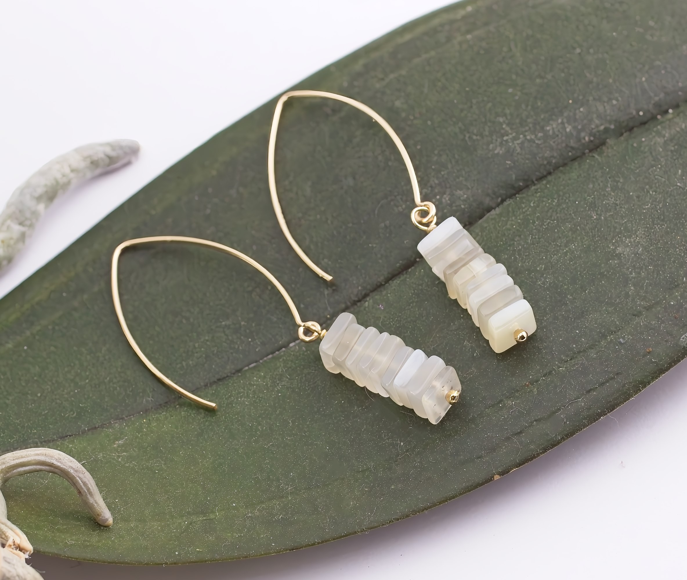 Incandescent color and intriguing shape, these dreamy moonstone earrings are fun and flattering. Each square heishi stone is a little piece of nature, suspended from gold filled V shaped earwires. They measure 2.25 inches long. Add a unique piece to your outfit!