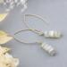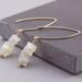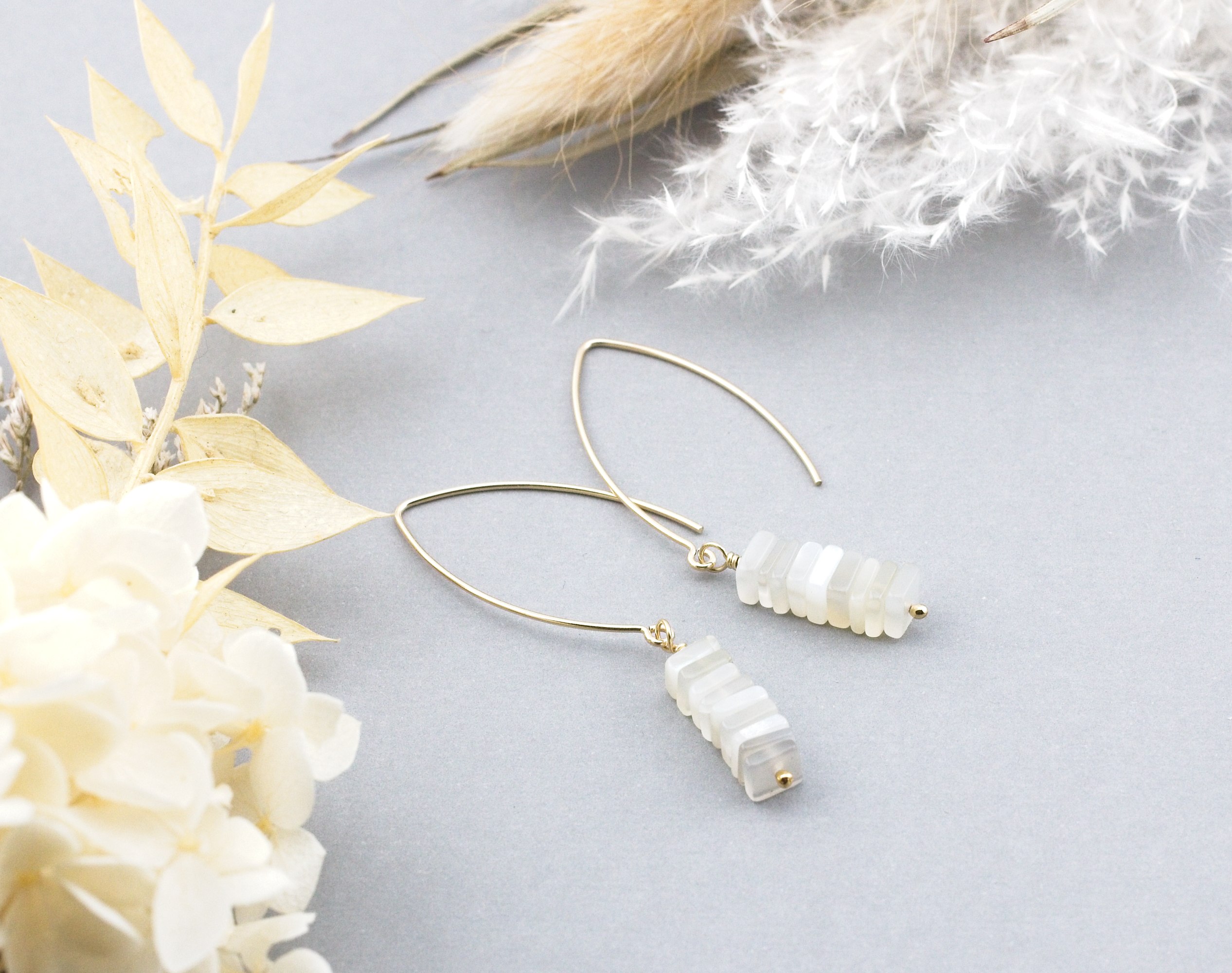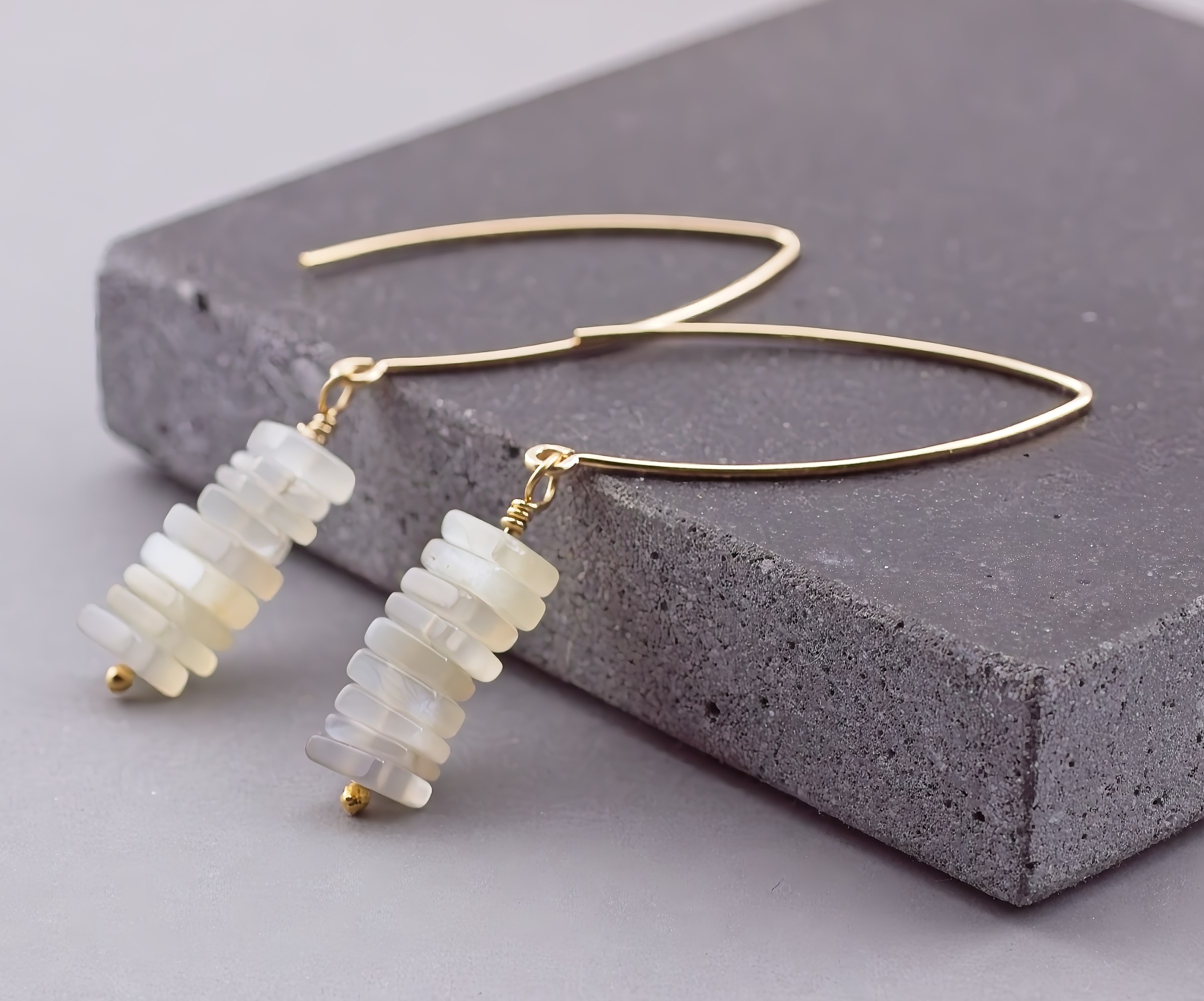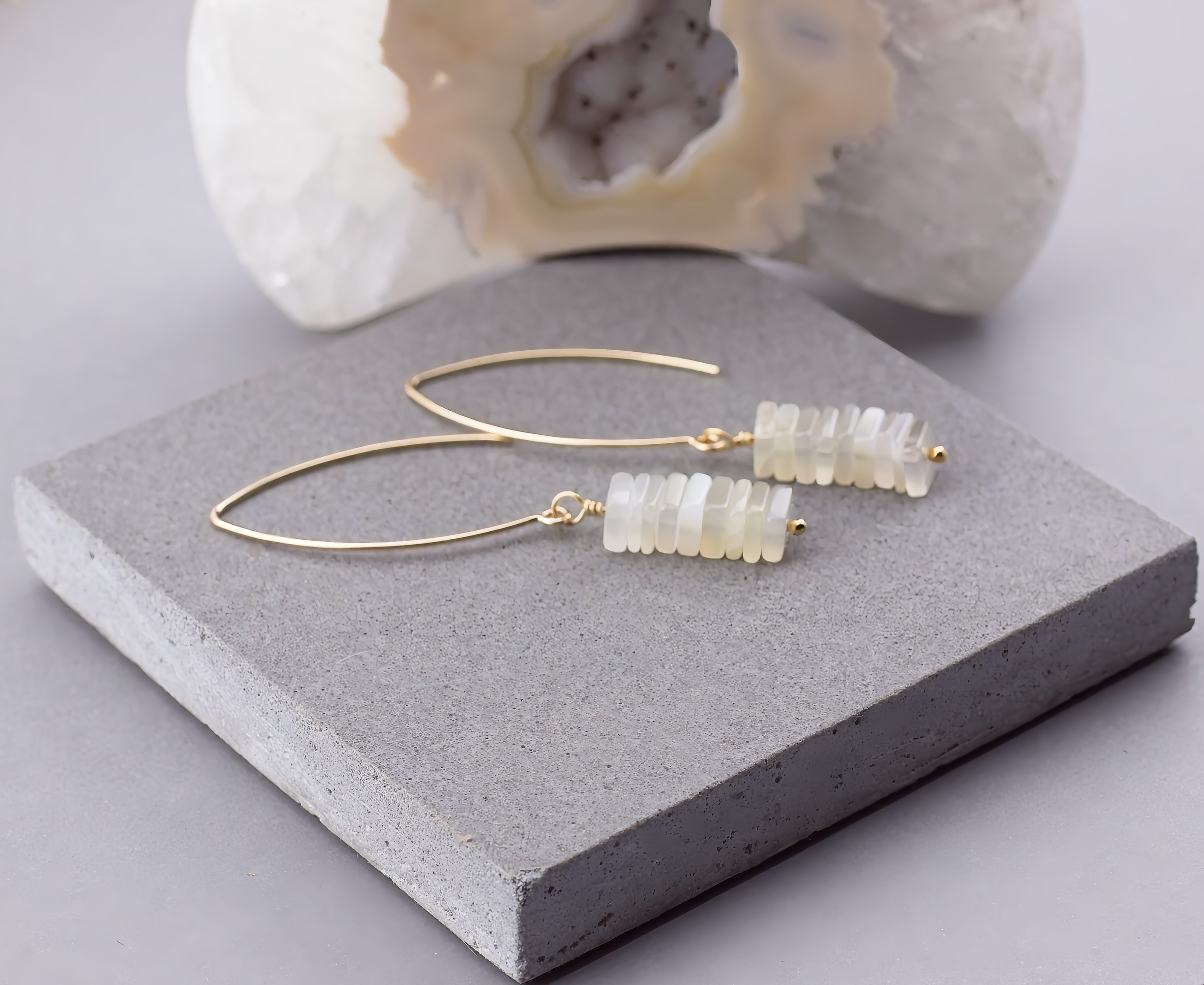 Incandescent color and intriguing shape, these dreamy moonstone earrings are fun and flattering. Each square heishi stone is a little piece of nature, suspended from gold filled V shaped earwires. They measure 2.25 inches long. Add a unique piece to your outfit!